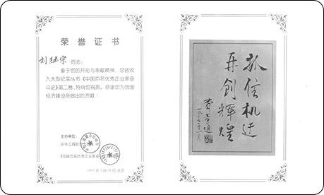 1997年3月,劉繼宗董事長被邀請參加“全國百名優(yōu)秀企業(yè)家大會”,業(yè)績被收入大型紀實叢書《中國百名優(yōu)秀企業(yè)家奮斗史》第二卷
