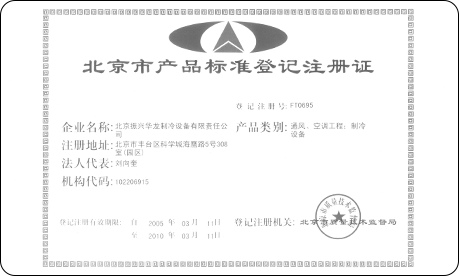 2005年,公司制冷設(shè)備產(chǎn)品被北京市質(zhì)量技術(shù)監(jiān)督局授予“北京市產(chǎn)品標準登記注冊證”。