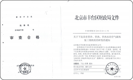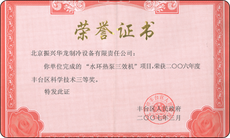 2007年7月,公司“水環(huán)熱泵三效機”研發(fā)項目,榮獲豐臺區(qū)科學技術(shù)獎三等獎。